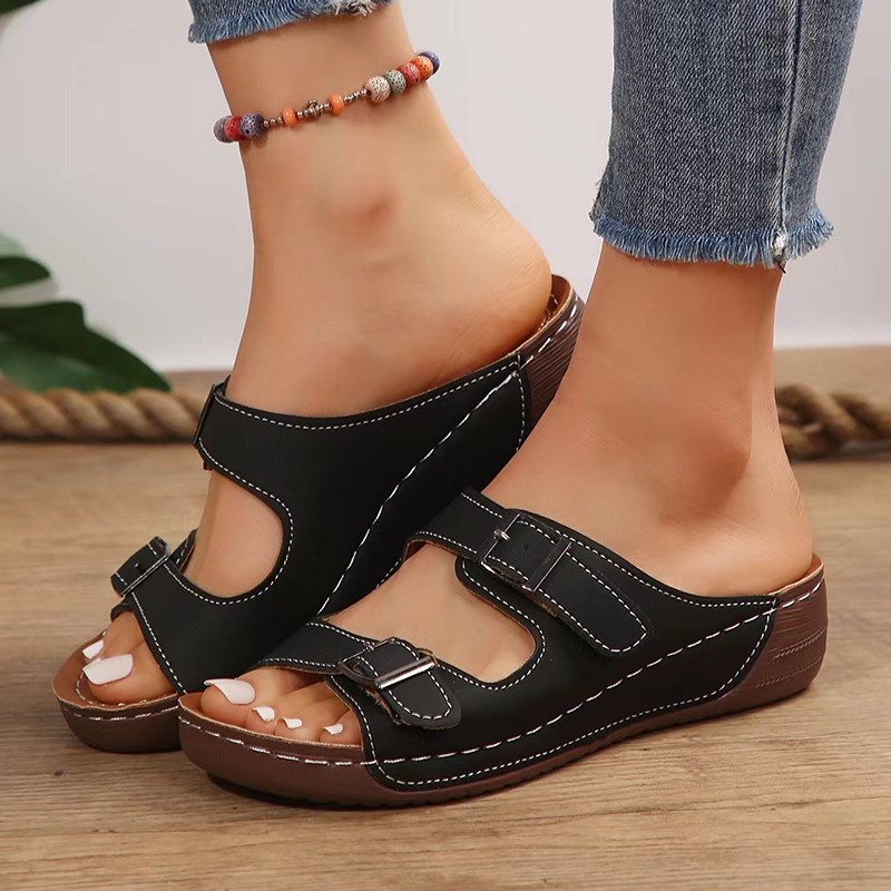 • Elegant Thickened Heels-These shock-resistant wedge heelsstretch the legs to the right height with a spongy cushion.